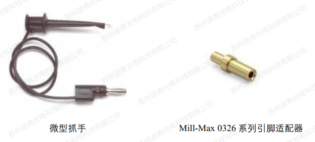 • 為連接DC直流引腳,你可以通過微型抓手(下方左圖)使用電線來連接,或使用Mill-Max制造公司(Mill-Max Manufacturing Corp)生產的如0327、0367系列的引腳適配器之類的特定部件來連接(下方右圖)。DC直流引腳可接受的直徑范圍:0.56-0.81毫米和1.14-1.65毫米給到GND接地引腳。