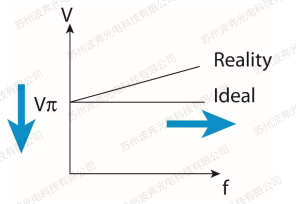 這是因為盡管與材料無關,但是設計和生產方面,任何射頻電子零部件,隨著頻率的升高都會有射頻的衰減,其功率從最高點下降到1/2的位置對應的頻率,我們稱為-3dB帶寬(請參考微信文章“iXblue電光調制器常見參數定義”)。雖然材料本身的參數并不隨頻率升高而變化,但是波導的電極等射頻部分不可避免的存在高頻衰減,因此調制器的射頻半波電壓Vp RF隨著頻率的升高而升高。