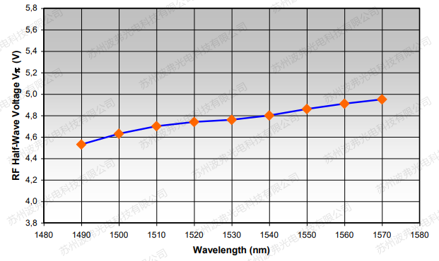 2.半波電壓與波長λ有關,波長越大,半波電壓越大,例如常規的iXblue調制器VpRF數值如下: