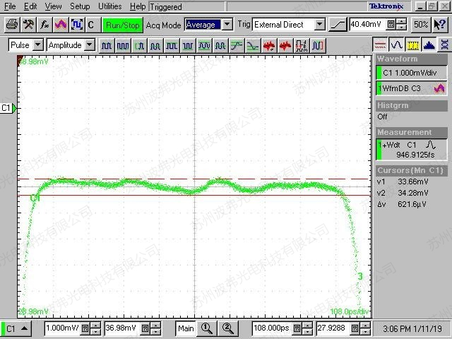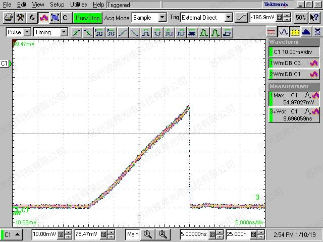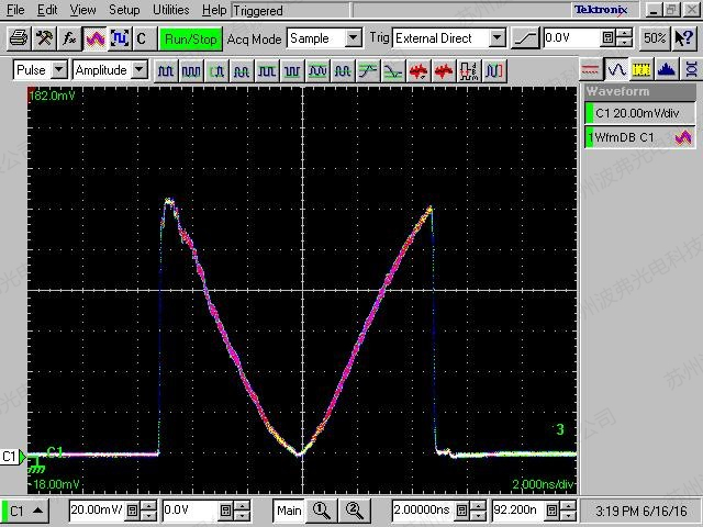 如圖所示,60 000個脈沖疊加,我們可以看到低振蕩和抖動的脈沖優異性,這個測量證明了ModBox-Front-end高穩定和可靠性的脈沖產生性能。