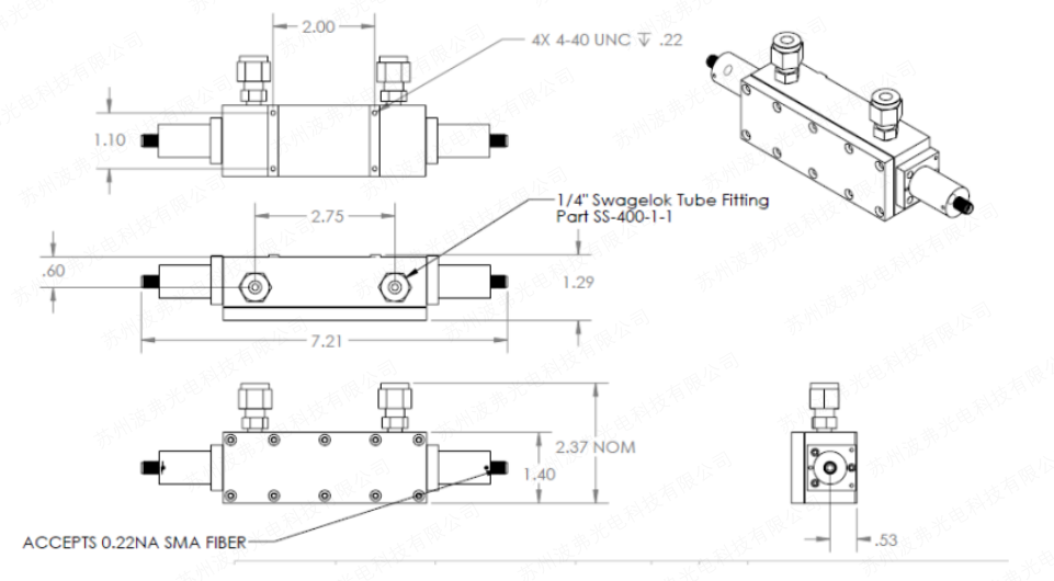 1.流通池有四個(gè)安裝孔,底部有4-40螺紋。