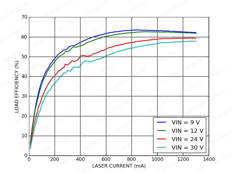 下圖顯示了具有200 mV激光驅(qū)動器壓降的CTL300E-1-1200控制器的整體負載效率(=激光電功率/輸入功率)。