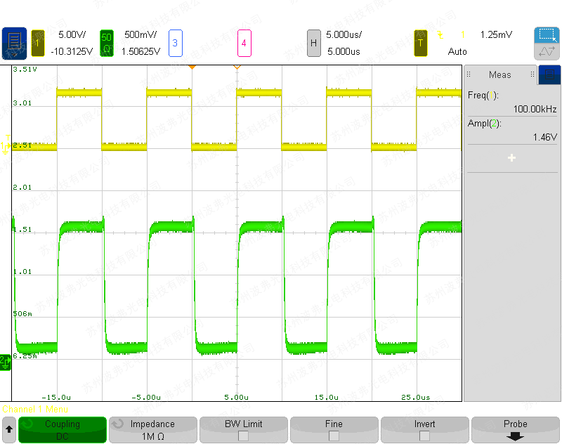 使用具有400 mV激光驅(qū)動器壓降的Thorlabs BL976-SAG300泵浦激光二極管在100 mA和600 mA之間切換的示例(黃色:BSEL信號3.3 V 100 kHz,綠色:激光二極管輸出功率):