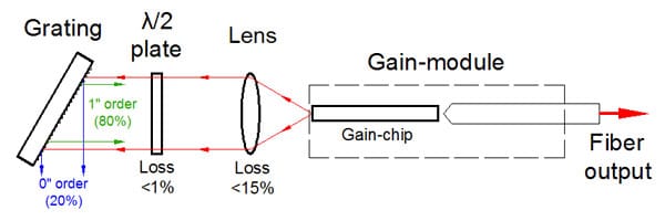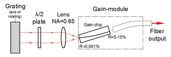 該設備包括帶有彎曲條紋的“C型”增益芯片。條紋傾斜的刻面專為外部反饋而設計,并具有深層 AR 涂層,從而使芯片波導的背反射極低。它確保了自激的阻斷,并消除了在外腔系統中操作時與復合腔相關的問題。這導致在整個調諧范圍內具有高邊模抑制比 (SMSR) 的非常精細的譜線。