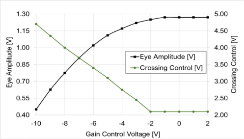 圖13至圖18中的數(shù)據(jù)是使用MICRAM DAC4信號(hào)源和帶有50GHz(SE-50)遠(yuǎn)程采樣模塊的LeCroy SDA 100G采樣示波器獲得的。所有測(cè)量均在270mV輸入眼振幅和51%輸入眼交叉點(diǎn)進(jìn)行。增益控制和交叉控制功能取決于輸入幅度。交互調(diào)整兩個(gè)控件以控制輸出振幅,同時(shí)保持50%的交叉點(diǎn),如圖15至圖18所示。